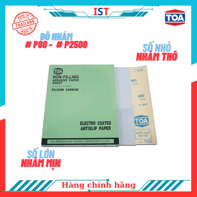 - Thương hiệu: TOA là thương hiệu sơn và vật liệu xây dựng nổi tiếng đến từ Thái Lan. Giấy nhám TOA được đánh giá cao bởi chất lượng tốt, giá thành hợp lý và độ bền cao.