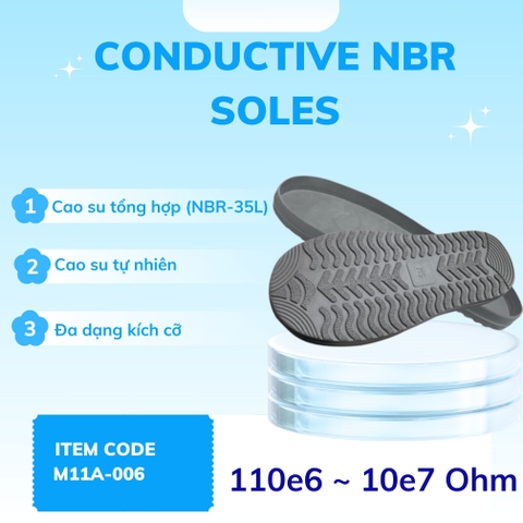 Conductive NBR Soles là loại đế giày được làm từ cao su nitrile butadiene (NBR), có khả năng dẫn điện. Đế giày này được thiết kế để tiêu tán tĩnh điện an toàn, giúp ngăn chặn việc tích tụ tĩnh điện trên cơ thể người sử dụng khi họ di chuyển. Điều này đặc biệt quan trọng trong môi trường làm việc yêu cầu kiểm soát tĩnh điện như phòng sạch, nhà máy điện tử, hoặc các khu vực sản xuất linh kiện nhạy cảm.