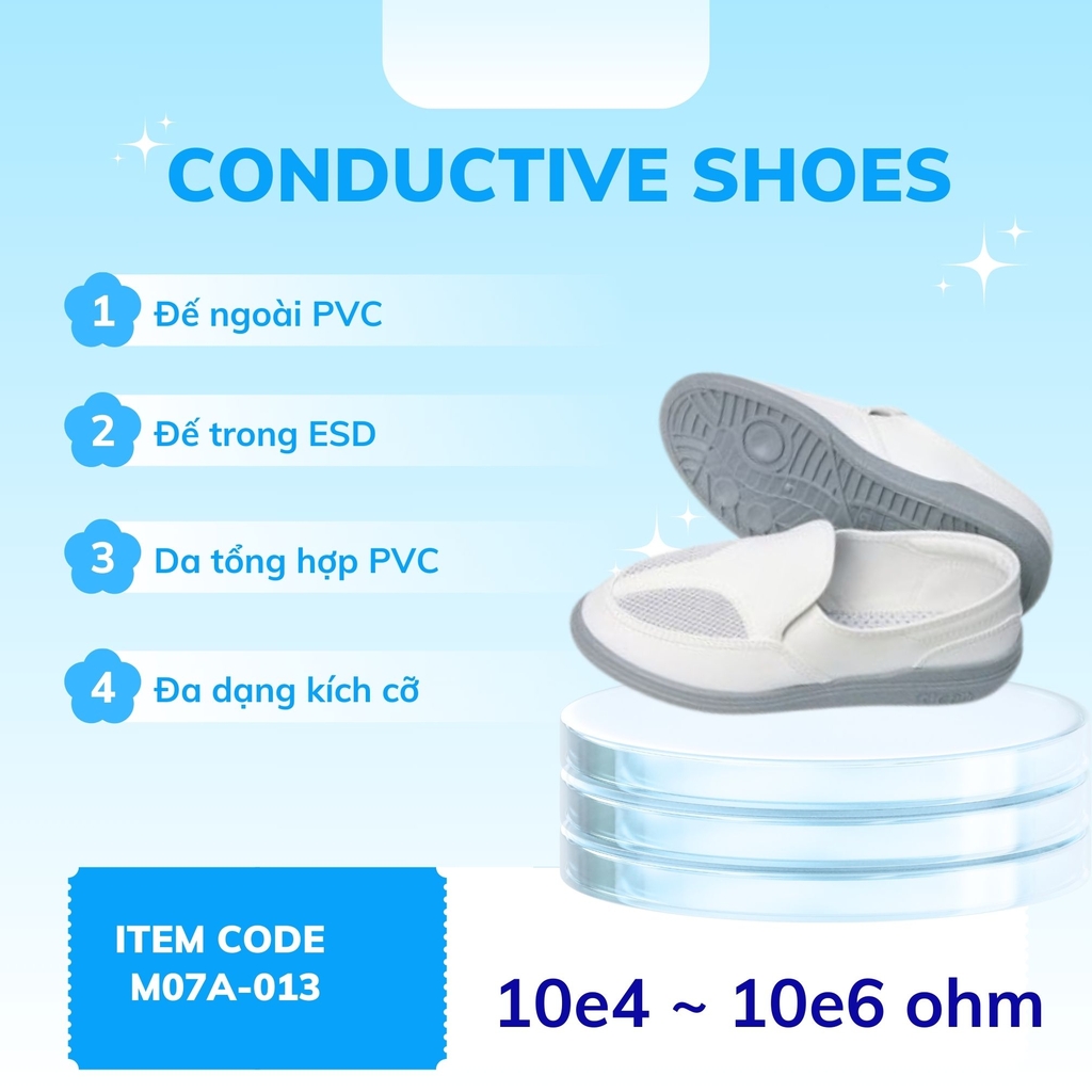 Conductive shoes (giày dẫn điện) là loại giày bảo hộ được thiết kế đặc biệt để dẫn điện từ cơ thể người mang đến mặt đất, giúp ngăn chặn sự tích tụ điện tích. Điều này rất quan trọng trong các môi trường làm việc có nguy cơ tiếp xúc với điện hoặc trong các khu vực dễ xảy ra cháy nổ do điện tích tĩnh.