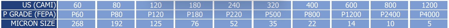 BẢNG SO SÁNH KÍCH CHUẨN GRIT VÀ MICRONSIZE THEO TIÊU CHUẨN CỦA MỸ (CAMI) SO VỚI CHUẨN CHÂU ÂU (P-FEPA)