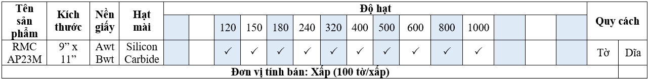 Nhám Nhật tờ RMC có đa dạng nhiều loại khác nhau về kích thước giấy nhám tờ và mức giá giấy nhám tờ. Dưới đây là là bảng thông số giấy nhám 100 tờ xấp các bạn có thể tham khảo: