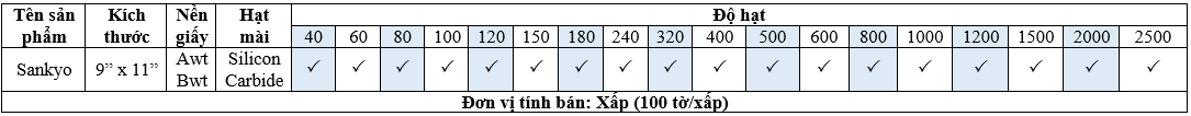 Giấy nhám Sankyo có nhiều loại độ hạt khác nhau, đáp ứng được nhiều nhu cầu sử dụng: giấy tờ thô, giấy nhám tờ mịn và giấy nhám tờ siêu mịn.