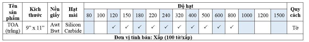 - Kích thước giấy nhám tờ: 250 x 280 mm