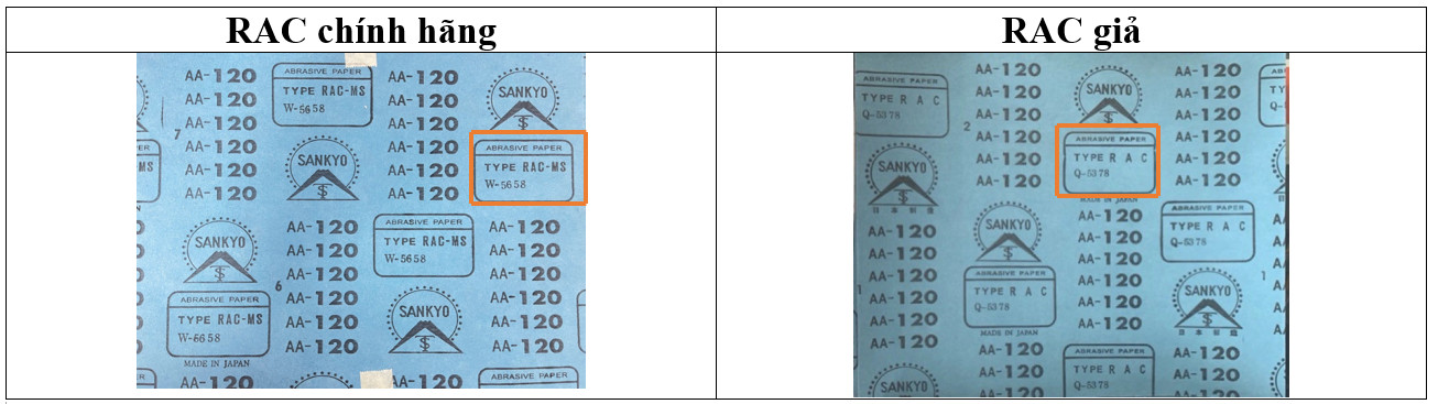 Giấy nhám RAC chính hãng ở mặt sau có ký hiệu "TYPE RAC-MS" khác với ký hiệu của RAC nhái tràn lan trên thị trường hiện nay là "TYPE R A C". Đây là cách nhận biết dễ dàng và nhanh chóng nhất để phân biệt hàng thật và hàng giả.